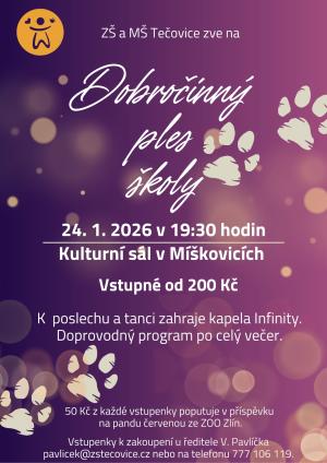 Zveme Vás na Dobročinný ples školy, který se uskuteční již tuto sobotu 24.1.2026 od 19:30 v Kulturním sále v Míškovicích. Těšit se můžete na bohatou tombolu, jejíž hlavní cenou bude TELEVIZE. Pro účastníky bude zajištěn autobus zpět do Tečovic.