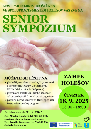 Zveme vás na Senior Sympozium, které se uskuteční ve spolupráci s městem Holešov. Těšit se můžete na odborné přednášky o zdraví a výživě, prezentaci sociálních služeb a poradnu zdraví.