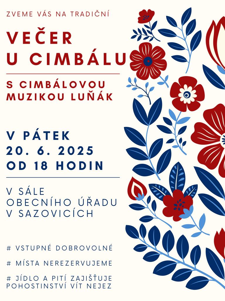 Zveme vás na večer s cimbálovou muzikou Luňák, který se koná v pátek 20. června 2025 od 18 hodin v sále Obecního úřadu v Sázenicích. Vstupné je dobrovolné a místa se nerezervují.