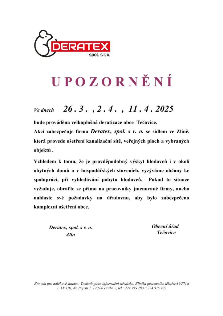 dne 26.3., 2.4., 11.4.2025 proběhne v naší obci velkoplošná deratizace firmou Deratex spol. s r.o.