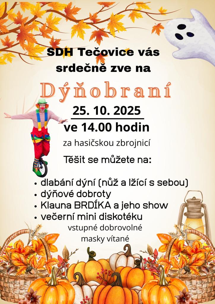 SDH srdečně zve všechny na Dýňobraní, které se koná 25. října 2025 od 14.00 hodin za hasičskou zbrojnicí.