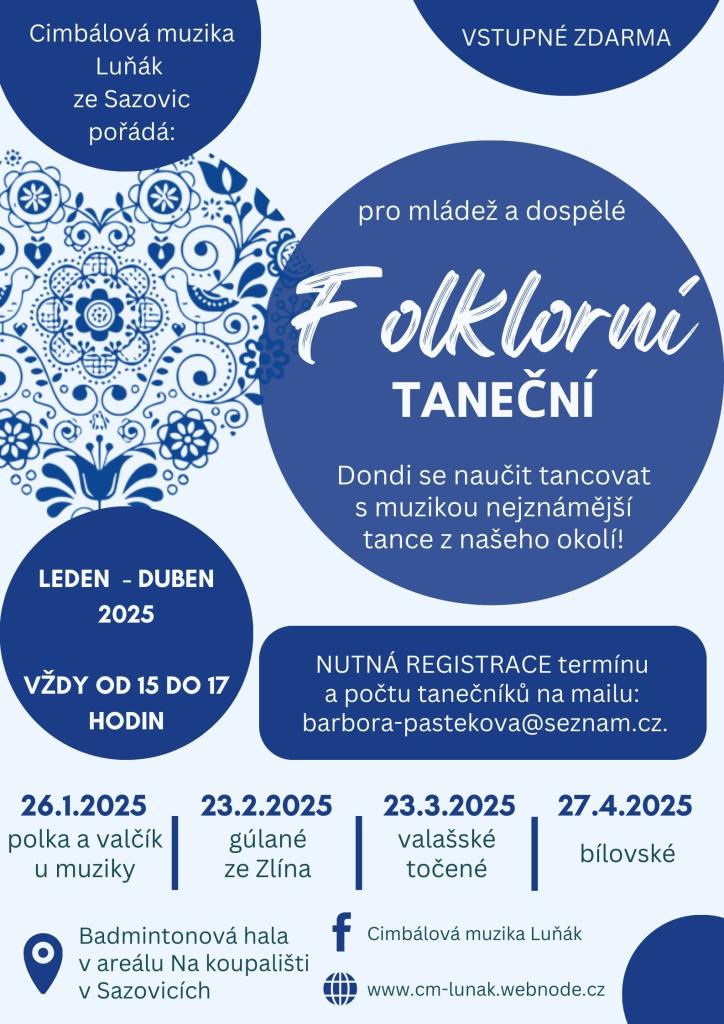Přijďte si užít odpoledne plné tance s cimbálovou muzikou Luňák v Sazovicích. Naučíte se nejznámější tance z okolí, jako jsou polka a valčík. Lekce budou probíhá od ledna do dubna 2025.