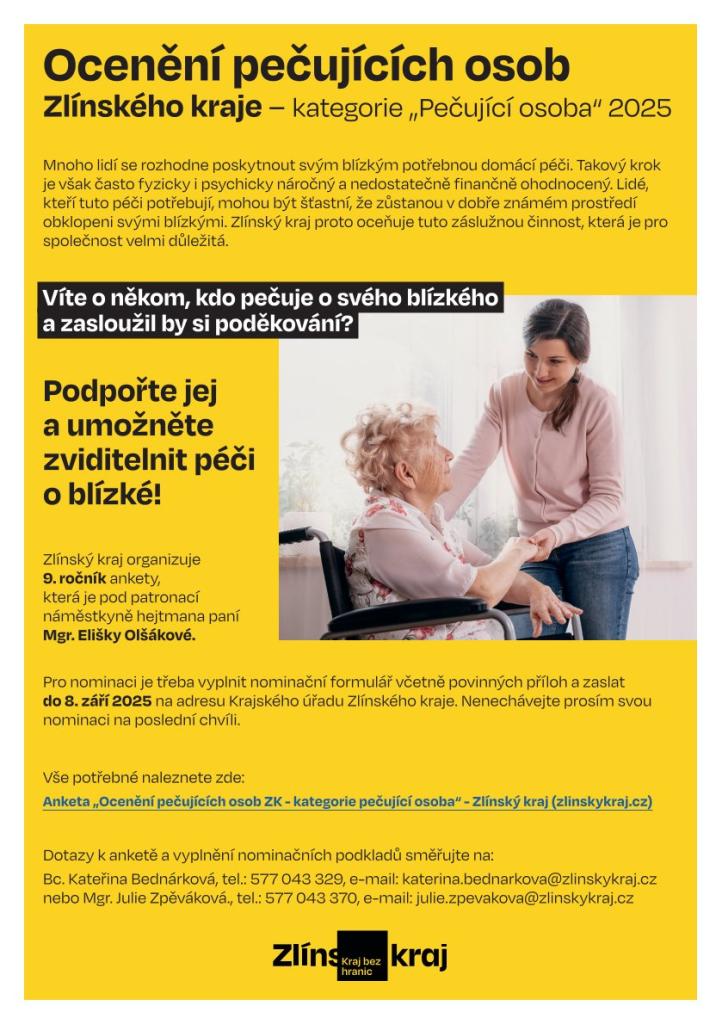 Zlínský kraj vyhlašuje 9. ročník ankety o ocenění pečujících osob, jejichž domácí péče je často přehlížena. Nominace je otevřena do 8. září 2025, neváhejte podpořit ty, kteří se starají o své blízké.