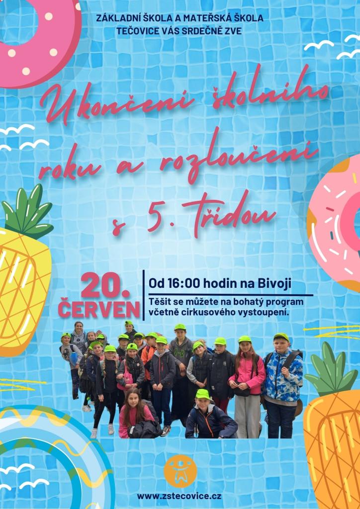 Základní škola a mateřská škola Tečovice vás srdečně zve na Ukončení školního roku a slavnostní rozloučení s žáky páté třídy, které se koná 20. června od 16:00 hodin na Bivoji. Těšit se můžete na bohatý program včetně cirkusového vystoupení.