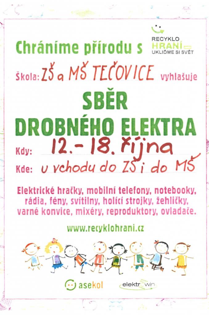 ZŠ a MŠ Tečovice vyhlašuje ve dnech 12.-18.10.2023 sběr drobného elektra. Sběr je možno přinést ke vchodu do ZŠ a MŠ.