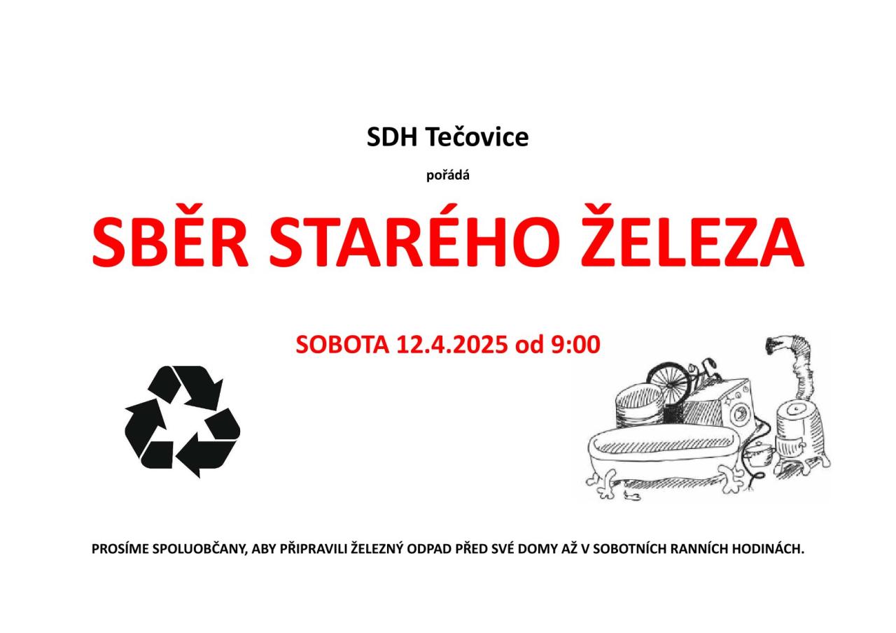 Sbor dobrovolných hasičů Tečovice pořádá sběr starého železa, který se uskuteční v sobotu 12. dubna 2025 od 9:00.