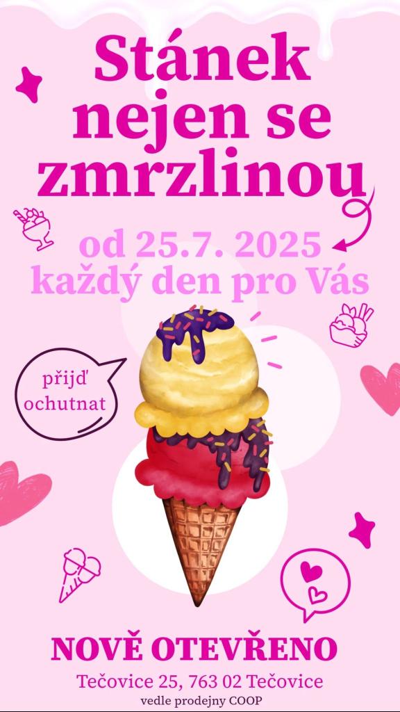 Od pátku 25.7.2025 se můžete s dětmi navštívit stánek nejen se zmrzlinou, který bude nabízet širokou nabídku zmrzliny, nápojů i něčeho k zakousnutí, bude umístěn vedle prodejny Coop.