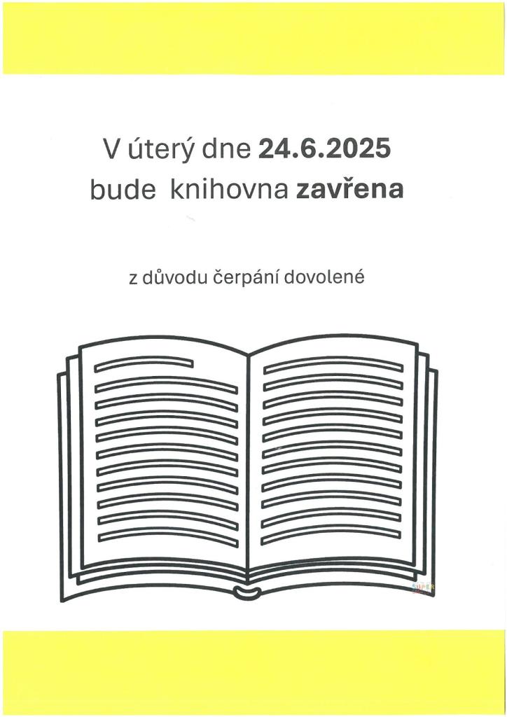 Oznamujeme občanům, že z důvodu čerpání řádné dovolené bude obecní knihovna dne 24.6.2025 uzavřena. Děkujeme za pochopení