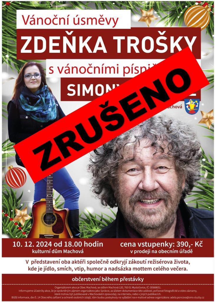 Pořadatelé Vám s lítostí oznamují, že plánované vánoční vystoupení Zdeňka Trošky muselo být zrušeno z důvodu nemoci. Omlouvájí se za případné nepříjemnosti.