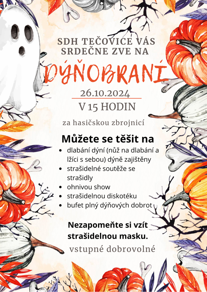 26.10.2024 uspořádal sbor dobrovolných hasičů Tečovice akci pod názvem Dýňobraní. Akce se moc vydařila a už se těšíme na příští rok.